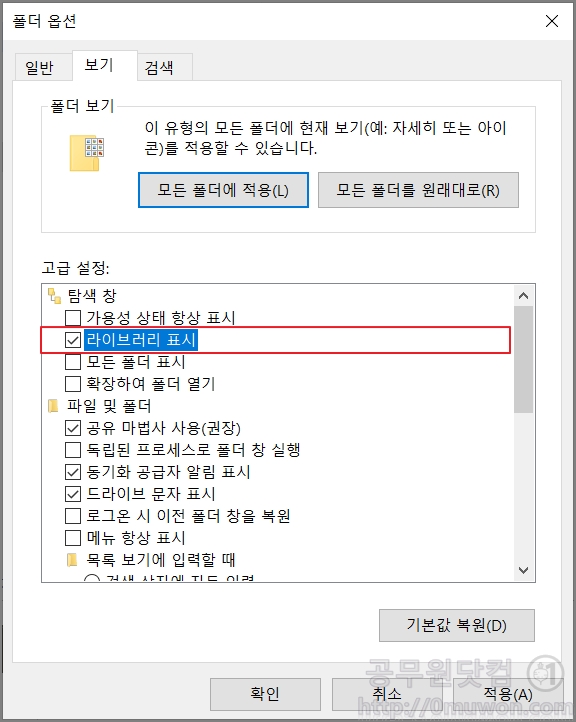 ▼ "폴더 옵션 > 보기 > 고급 설정" 에서 라이브러리 표시에 체크를 합니다.