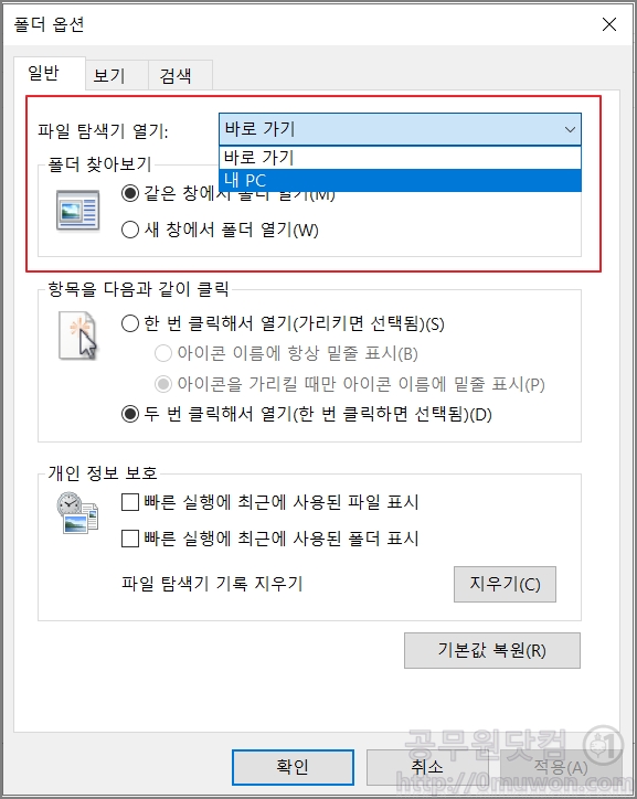 ▼ "폴더 옵션 > 일반 > 파일 탐색기 열기" 에서 바로가기를 "내 PC" 로 변경합니다.