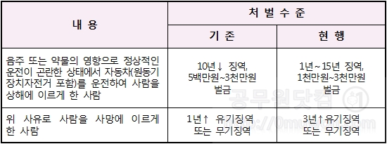 음주운전으로 사람이 다치는 경우는 「특정범죄 가중처벌 등에 관한 법률」에 의해 부상사고인 경우 1년 이상 15년 이하의 징역 또는 1,000만원 이상 3,000만원 이하의 벌금, 사망사고인 경우 무기 또는 3년 이상의 징역형을 처벌받습니다.