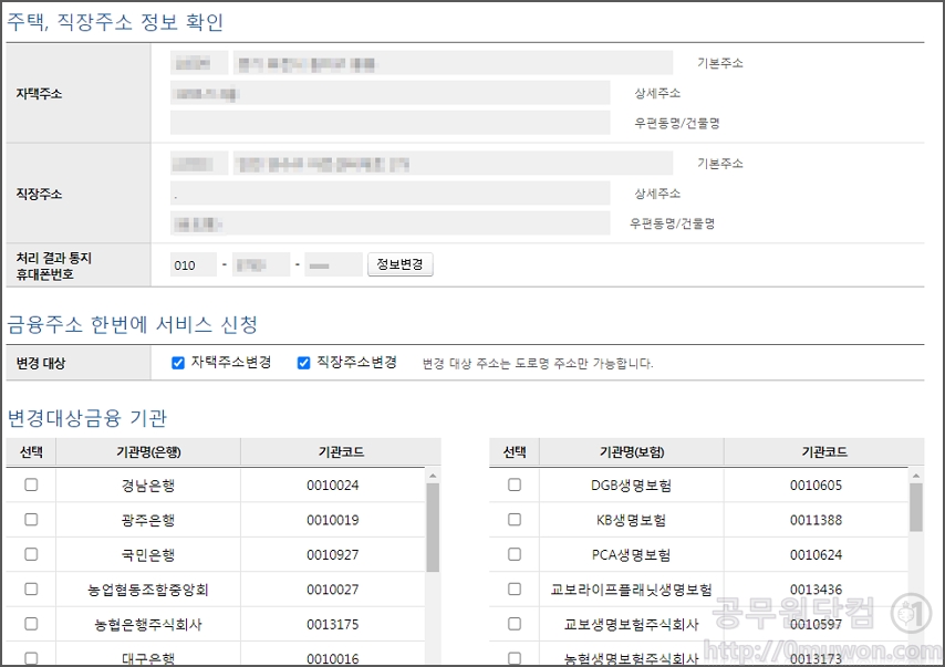 주택, 직장주소 정보를 확인합니다. 변경 대상 금융 기관을 선택 후 신청을 하면 됩니다.