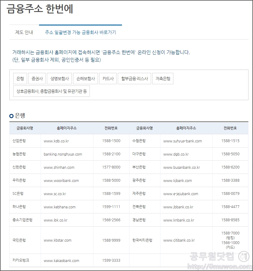 마지막은 가장 추천하는 금융주소 한방에 서비스입니다. 금융주소 한번에 서비스는 주소를 변경하기 위하여 금융회사를 일일이 방문하거나 연락해야 하는 번거로움을 덜어드리기 위해 금융회사끼리 협조를 하여 본인이 이용하고 있는 한 금융회사에서 신청을 하면 다른 금융회사의 주소도 일괄적으로 변경 신청해 주는 서비스입니다. 거의 모든 주소를 한번에 변경할 수 있습니다. <▼ 금융주소 한번에 서비스 바로가기>