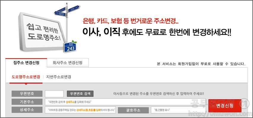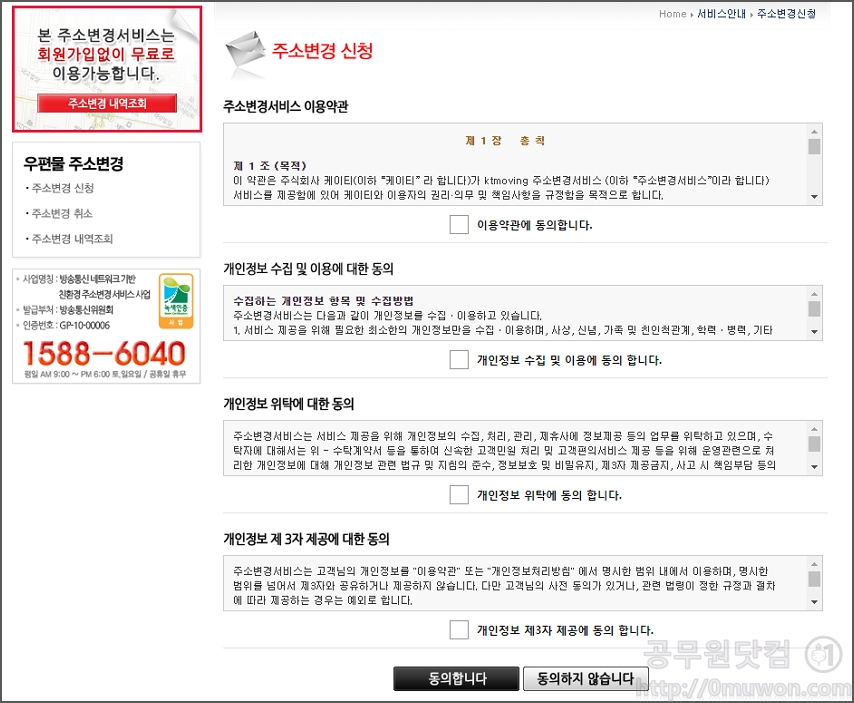 주소변경서비스는 회원가입없이 무로로 이용이 가능합니다. 사용을 위해 이용약관 등을 동의를 합니다.