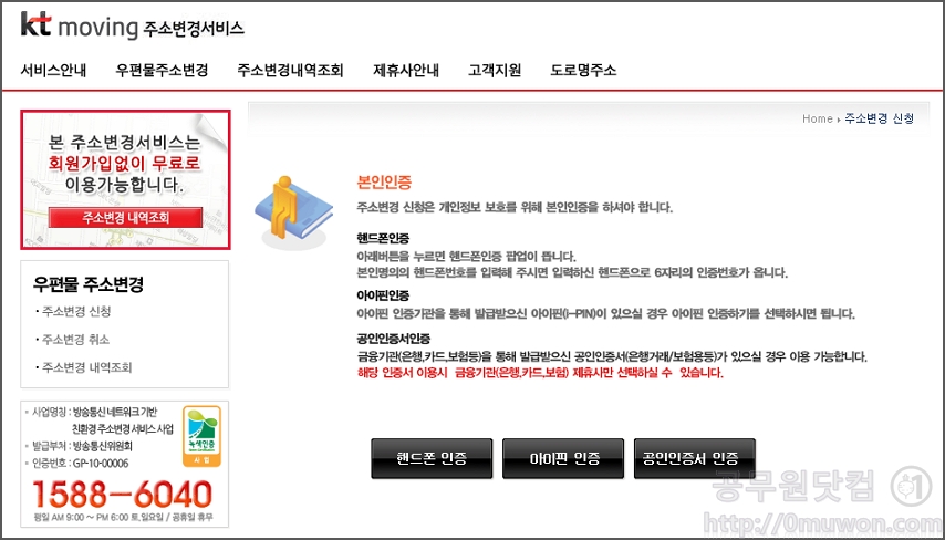 주소변경 신청은 본인인증을 해야 합니다. 남이 이사도 안갔는데 주소를 변경하게 되면 더 큰일이겠죠. 핸드폰인증, 아이핀 인증, 공인인증서인증 등을 통해 인증을 하면 됩니다.