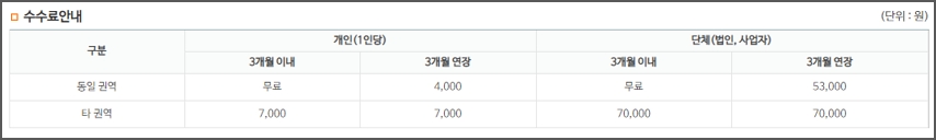 수수료는 개인의 경우 동일 권역 3개월 이내는 무료, 3개월을 연장하는 경우에는 4000원입니다. 타권역은 동일권역 7000원, 3개월 연장도 7000원입니다.