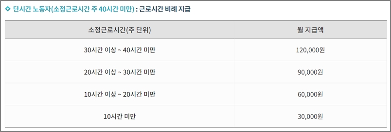 ▼ 주 40시간 미만 단시간 노동자의 경우 근로시간에 비례하여 지급을 합니다. 주 근로시간이 10시간 이상 20시간 미만이면 3만원입니다.