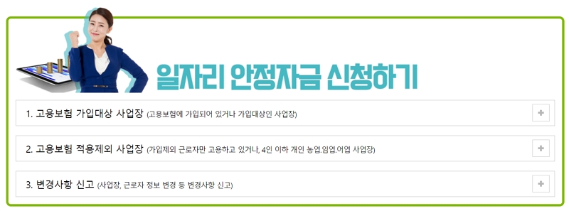 ▼ 일자리 안정자금 신청하기에서 해당되는 것을 선택합니다. 고용보험 가입대상 사업장, 고용보험 적용제외 사업장 등에서 선택을 하면 됩니다.