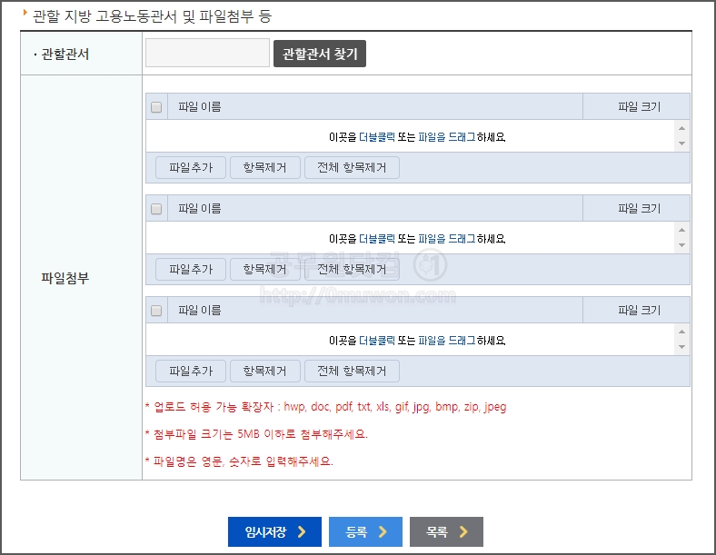 ▼ 관할 지방 고용노동관서를 지정하고, 첨부할 파일이 있으면 첨부를 합니다. 파일크기는 5MB 이하로 첨부하세요. 파일 첨부는 필수는 아니나, 임금체불 증빙서류가 있으면 같이 제출하시는게 유리합니다.