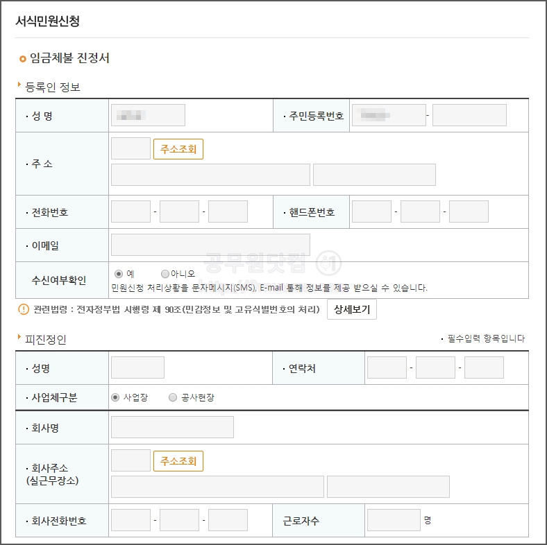 ▼ 임금체불 진정서를 작성합니다. 임금체불 진정서는 등록인 정보, 피진정인 정보, 진정내용, 관할 지방고용노동관서 및 파일첨부 등으로 구성되어 있습니다. 임금체불이 된 근로자의 정보와 임금체불을 한 피진정인의 정보를 입력합니다. 민원신청 처리사항을 문자메시지나 이메일을 통해 제공 받을 수 있습니다. 자주 확인하지 못하는 분들은 수신여부확인에 "예"를 선택하면 좋습니다.