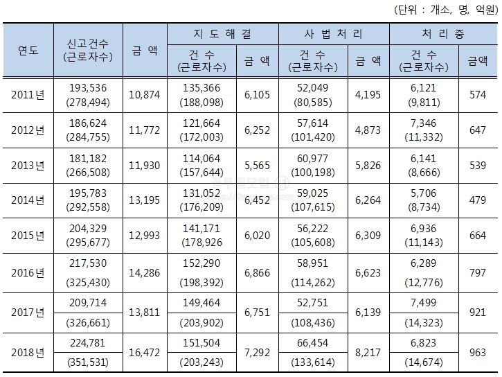 2018년도말 기준 연도별 임금체불 현황입니다. 매년 약 20만건의 임금체불 신고가 있습니다. 많은 숫자라는 생각이 듭니다. 2018년에는 약 22만건의 신고가 있었습니다. 그중에서 지도해결 15만건, 사법처리 6만6천건, 처리중이 6천8백건 정도 되네요.