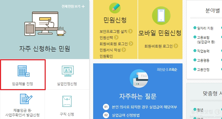 ▼ 먼저 고용노동부 홈페이지에 접속을 합니다. 민원마당을 클릭합니다. 민원신청 조회 및 질의 상당 서비스 등을 이용할 수 있습니다. <고용노동부 바로가기>
