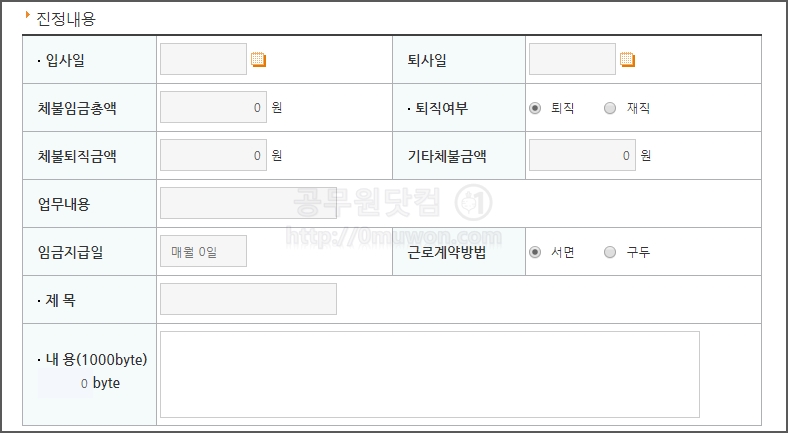 ▼ 진정내용을 입력합니다. 입사일, 퇴사일, 체불임금총액, 퇴직여부, 체불퇴직금액, 업무 등을 입력합니다. 진정내용을 솔직하게 500자 이내로 적으시면 됩니다. 임금체불상황에 대하여 정확하고 상세하게 작성하면 됩니다.