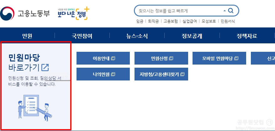 ▼ 먼저 고용노동부 홈페이지에 접속을 합니다. 민원마당을 클릭합니다. 민원신청 조회 및 질의 상당 서비스 등을 이용할 수 있습니다. <고용노동부 바로가기>