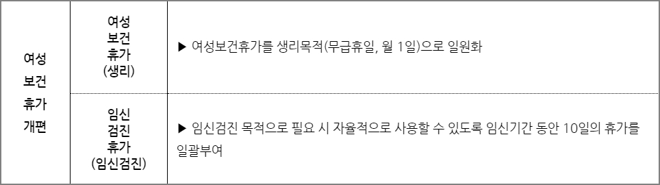 (현행) 임신 여성공무원이 임신기간(약 10개월) 동안 월 1일씩 여성보건휴가 사용 가능합니다.