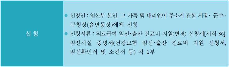 수급자는 임신 출산을 증명할 수 있는 사실증명서와 의료급여 임신 출산 진료비 지원 신청서 등의 서류를 주소지 관할 주민센터 등에 제출을 하면 됩니다. 사실증명서 대신 의사소견서도 가능하나, 이 경우는 발생한 지 1주일 이내만 인정이 됩니다.