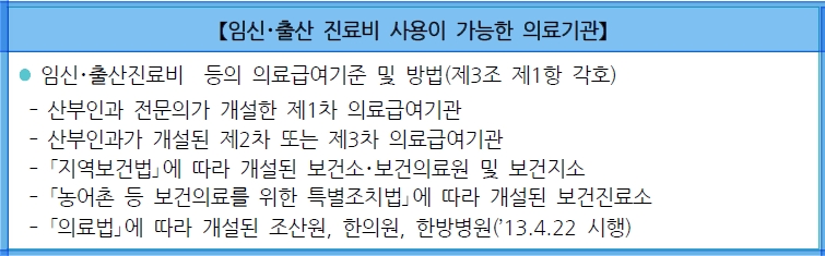 임신 출산 진료비는 입원, 외래를 불문하고 의료급여기관에서 산부인과 진료과목으로 진료 받은 본인부담금(비급여 포함)에 대하여 사용 가능합니다. 영아에게 임신 출산 진료비를 사용할 경우에는 모든 병원에서 사용이 가능합니다.