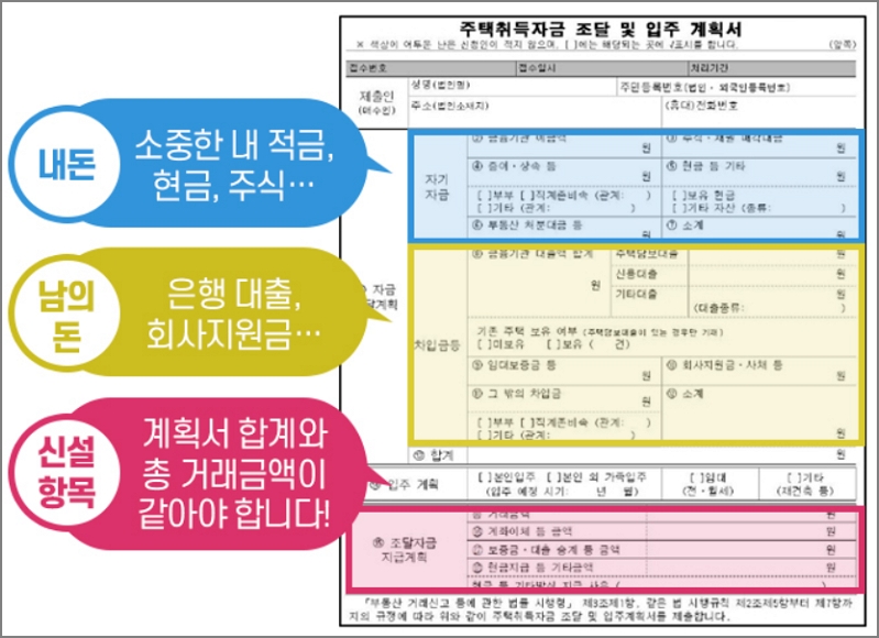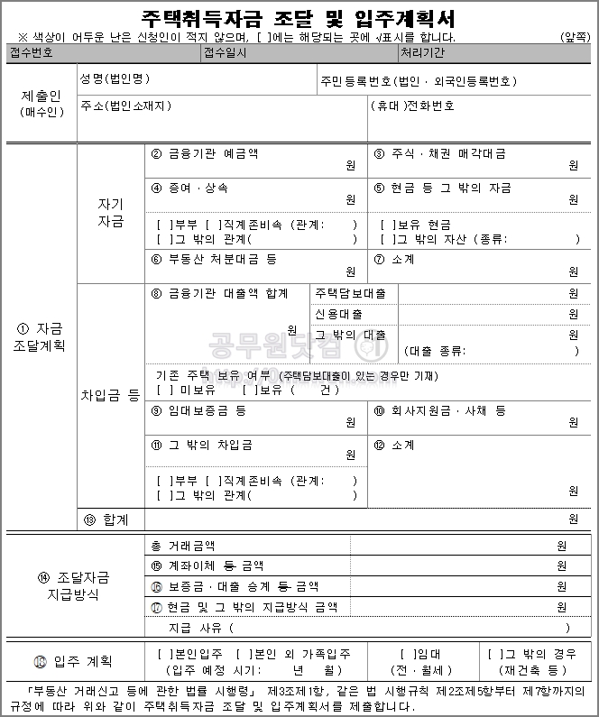 아래 그림은 주택취득자금 조달 및 입주계획서 양식입니다. 색상이 어두운 난은 신청인이 작성하지 않습니다.