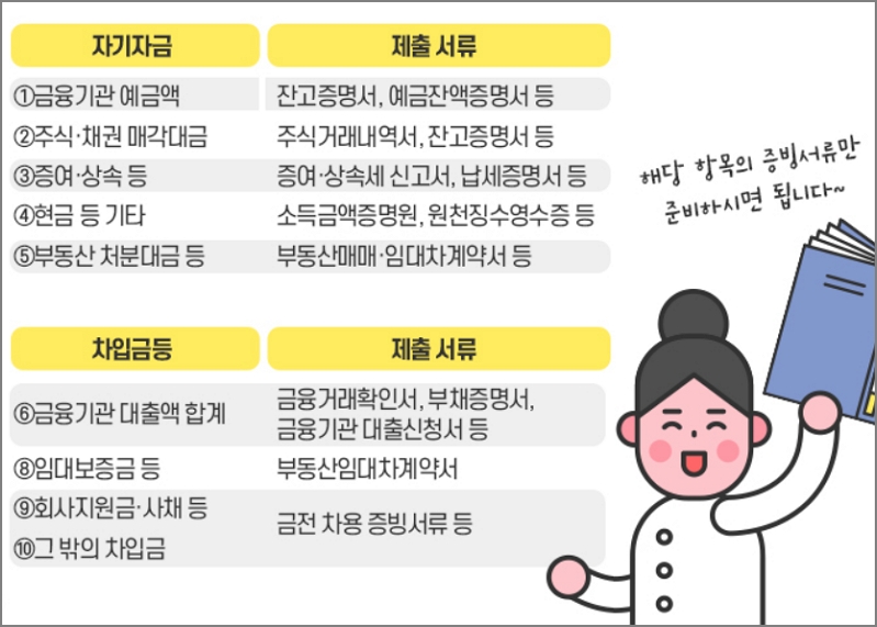 증빙자료는 예금잔액증명서, 주식거래내역서, 증여세 신고서 총 3개 서류 제출합니다. 금융거래확인서, 회사지원금대출확인서는 대출 실행 후 소명 요구 시 제출하면 됩니다.