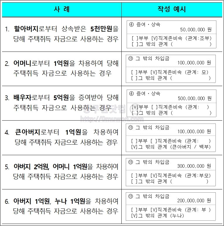 ▼ 증여‧상속, 현금 등 그 밖의 자금, 그 밖의 차입금 칸에는 자금 제공자의 관계를 기재합니다. 자금 제공자가 다수인 경우 해당되는 칸에 각각 체크한 후 관계를 각각 기재하고, 금액은 합산된 금액을 기재하면 됩니다.