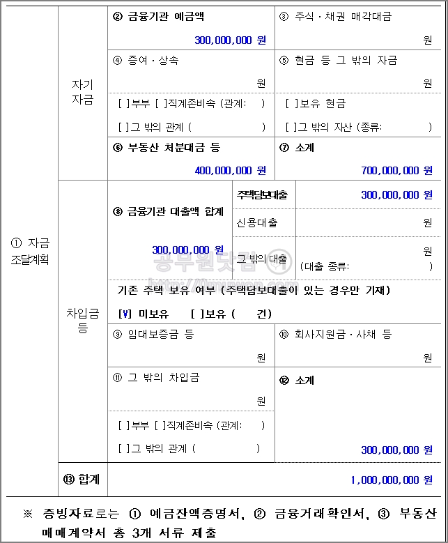 ▼ 투기과열지구 내 10억원의 주택을 구입하면서 ①금융기관 예금액 3억원, ②주택담보대출 3억원, ③부동산 처분대금 4억원으로 자금을 조달할 계획인 경우 자금조달계획서 작성 요령입니다. 증빙자료로는 예금잔액증명서, 금융거래확인서, 부동산매매계약서 총 3개를 제출합니다.