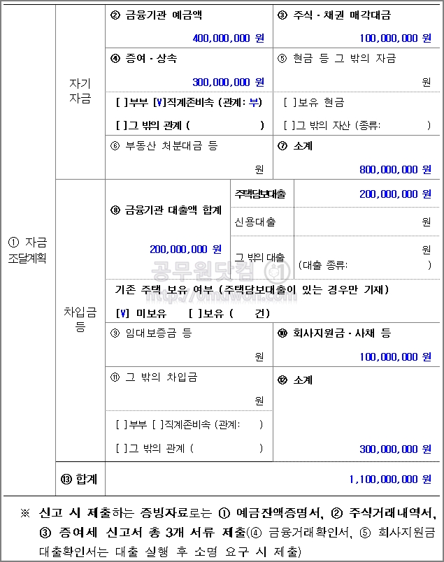 ▼ 투기과열지구 내 11억원의 주택을 구입하면서 ①금융기관 예금액 4억원, ②주식 매각대금 1억원, ③증여(아버지) 3억원, ④주택담보대출 2억원(잔금 지급 시 실행), ⑤회사지원금 1억원(잔금 지급 시 실행)으로 자금을 조달할 경우 작성방법입니다.