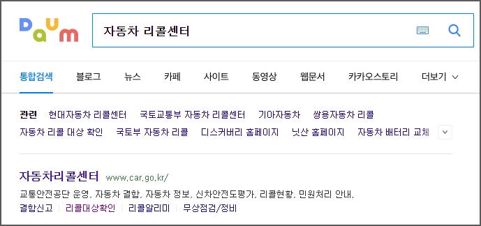 검색 페이지에서 자동차 리콜센터로 검색 하시면 접속하실 수 있습니다. 자동차 리콜센터 홈페지이에서는 자동차 결함, 자동차 정보, 신차안전도평가, 리콜현황, 자동차 결함신고 등의 서비스도 이용을 할 수 있습니다.