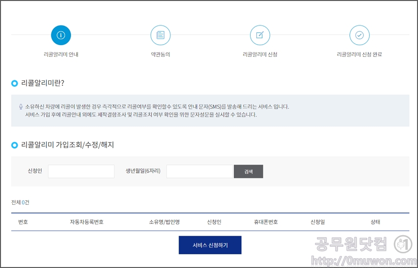 자동차 리콜알리미 서비스에 가입하면 리콜대상인 경우 바로 문자로 알려주기 때문에 유용합니다. 리콜 받은 차량도 리콜대상인지 몰랐는데 차량 정비 받을 때 정비기사님이 알려주셔서 리콜을 받았었습니다. 이렇게 문자로 바로 받을 수 있다면 바로 리콜을 받을 수 있습니다. 차량 소유주분 들은 꼭 신청하시기 바랍니다. <리콜알리미 서비스 바로가기>