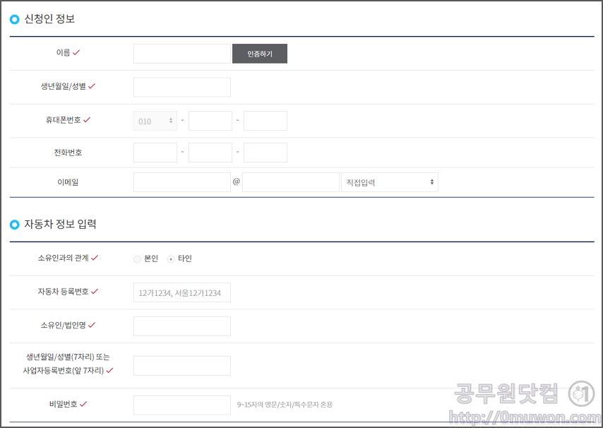 리콜알리미 신청서를 작성합니다. 작성해야 할 정보는 이름, 생년월일, 휴대폰번호 입니다. 그리고 자동 정보를 입력합니다. 자동차 소유인과의 관계, 자동차 등록번호, 소유인, 생년월일, 비밀번호를 입력합니다.