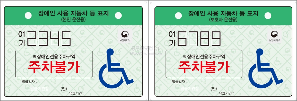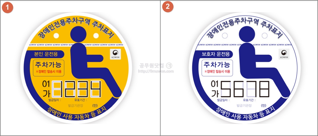 '장애인전용 주차구역 주차표지'와 '장애인사용 자동차 등 표지' 입니다.