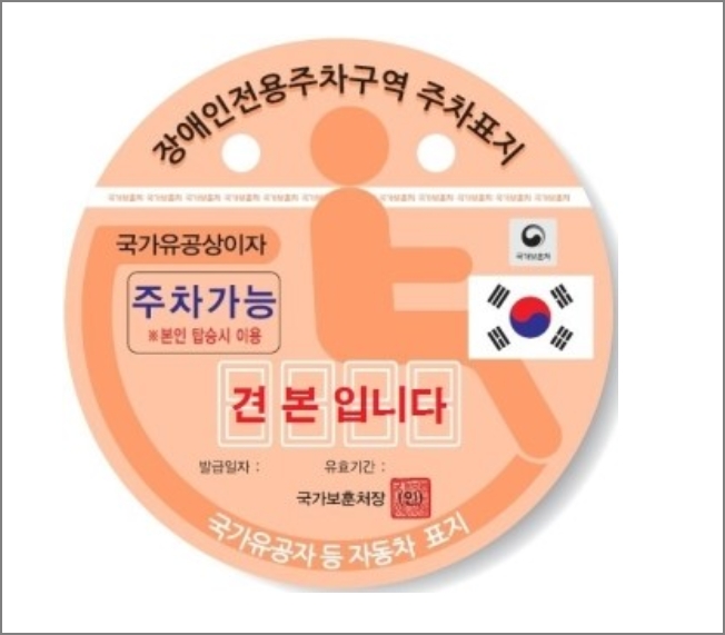 주차가 가능한 국가유공자 표지는 (살구색 원형) 표지입니다. 휠체어를 형상화한 살구색 원형 디자인입니다. 일반 장애인들과 구부분하여 국가유공자의 상징성을 나타내기 위해 태극기 심벌을 우측에 부착한 것이 큰 특징입니다. 사각형으로 된 하늘색 국가유공상이자 자동차 표지인 경우는 주차가 불가합니다.