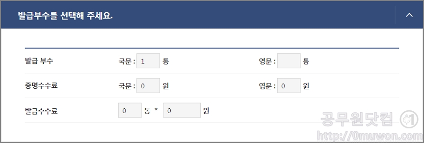 ▼ 발급부수를 선택합니다. 국문 재학증명서, 영문 재학증명서 발급이 가능합니다. 부수를 선택하면 증명수수료와 방급수수료가 자동으로 나옵니다.