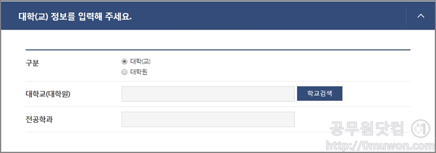 ▼ 대학(교) 정보를 입력합니다. 대학교, 대학원을 선택합니다. 학교검색 후 전공학과를 입력합니다.