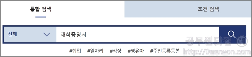 ▼ 정부24 홈페이지 통합검색 창에서 "재학증명서"를 검색합니다.