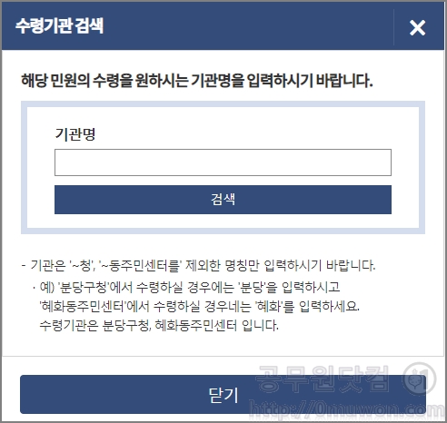 ▼ 기관은 ~청, ~동주민세터를 제외한 명칭만 입력하면 됩니다. 분당구청에서 수령할 경우에는 분당을 입력하고, 혜화동주민센터에서 수령하는 경우는 혜화를 입력하면 됩니다.