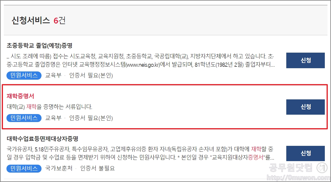 ▼ 재학증명서와 관련된 신청서비스가 6건 검색이 됩니다. 그 중 2번째에 있는 재학증명서에서 "신청" 버튼을 클릭합니다. 로그인이 필요한 서비스이므로 공인인증서 등을 이용해 본인 인증을 합니다.