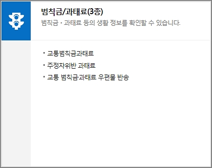 교통범칙금 과태료, 주정차위반 과태료, 교통 범칙금 과태료 우편물 발송 등의 생활정보를 확인할 수 있습니다. 납부도 가능합니다.