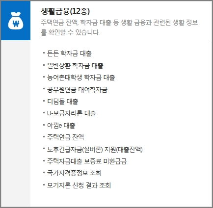 든든 학자금 대출, 일반상환 학자금 대출, 농어촌대학생 학자금 대출, 공무원연금 대여학자금, 디딤돌 대출, U-보금자리론 대출, 아낌e 대출, 주택연금 잔액, 노후긴급자금(실버론) 지원 대출잔액, 주택자금대출 보증료 미환금금, 국가자격증정보 조회, 모기지론 신청 결과 조회 등의 정보를 확인할 수 있습니다.