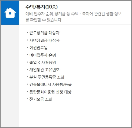 근로장려금 대상자, 자녀장려금 대상자, 여권만료일, 예비입주자 순위, 출입국 사실증명, 개인통관 고유번호, 분실 주민등록증 조회, 건축물에너지 사용량/등급, 통합문화이용권 신청 대상, 전기요금 조회 등의 생활정보 확인이 가능합니다. 전기요금 조회를 위해서는 한전 고객번호 정보를 입력하여야합니다. 그리고 건축물에너지 사용량/등급 확인을 위해서는 계량기 정보를 입력해야 정보가 제공이 됩니다.