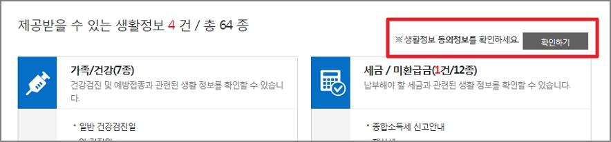 화면 중간에 생활정보 동의 정보를 확인하세요. 확인하기 버튼을 클릭합니다.