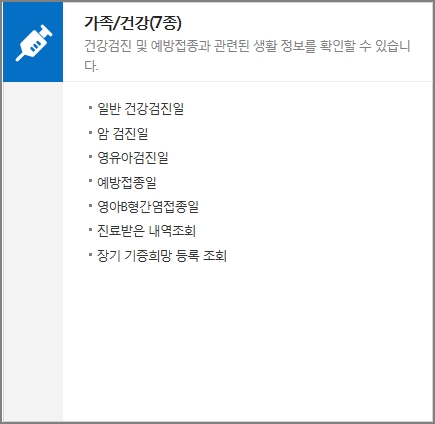 일반 건강검진일, 암 검진일, 영유아검진일, 예장접종일, 영아B형간염접종일, 진료받은 내역조회, 장기 기증희망 등록 조회 등 건강검진 및 예방접종 생활정보를 확인할 수 있습니다. 장기기증 희망 등록 조회를 이용하기 위해서는 장기기증 등록번호를 추가로 입력하여야 합니다.