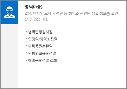 병역판정검사일, 입영일, 병역소집일, 병력동원훈련일, 민방위교육훈련일, 예비군훈련일 조회 등 입영 민방위 교육 훈련일 등 병역 생활정보를 제공합니다.