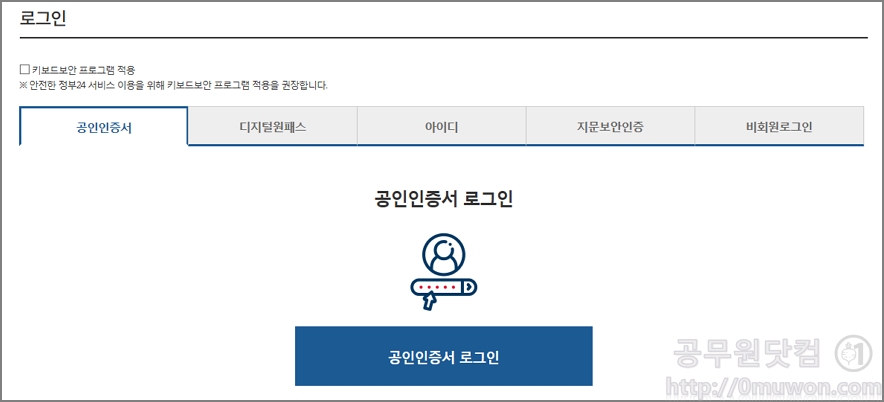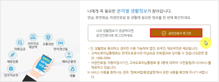 공인인증서로 로그인을 하여야 나의 생활정보를 이용할 수 있습니다.