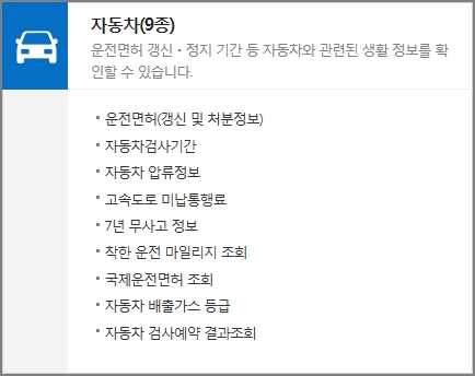 운전면허 갱신 및 처분정보, 자동차 검사기간, 자동차 압류정보, 고속도로 미납통행료, 7년 무사고 정보, 착한 운전 마일리지 조회, 국제운전면허 조회, 자동차 배출가스 등급, 자동차 검사예약 결과조회 등 자동차와 관련된 생활정보 확인이 가능합니다. 자동차 검사기간, 압류정보, 고속도로 미납통행료 확인을 위해서는 자동차등록번호를 입력하여야 합니다.