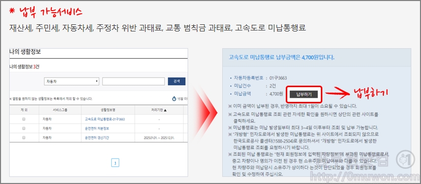 재산세, 주민세, 자동차세, 주정차 위반 과태료, 교통 범칙금 과태료, 고속도로 미납통행료의 경우는 납부도 가능합니다. 생활정보 확인 후 바로바로 납부하시면 됩니다. 나의 생활정보에서 납부를 원하시는 서비스를 선택하면 납부가 가능합니다.