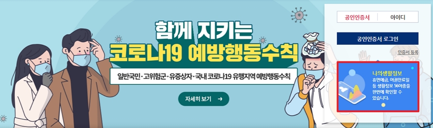 현재 가족/건강, 세금/미환급금, 연금, 병역, 범칙금/과태료, 자동차, 생활금융, 주택/복지 등 8개 분야 64종의 생활정보가 제공되고 있습다. 차례대로 알아볼께요.