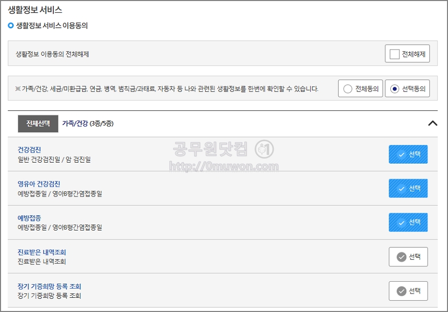 생활정보 서비스에서 정보제공을 원하는 생활정보를 선택합니다. 모든 생활정보를 이용하려면 전체동의 버튼을 클릭하면 모두 선택이 됩니다. 본인에게 필요한 정보는 선택하시면 됩니다.