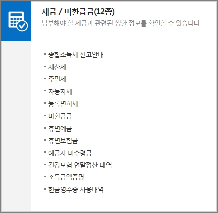 종합소득세 신고안내, 재산세, 주민세, 자동차세, 등록면허세, 미환급금, 휴면예금, 휴면보험금, 예금자 미수령금, 건강보험 연말정산 내역, 소득금액증명, 현금영수증 사용내역 등 납부해야할 세금 생활정보를 볼수 있습니다.