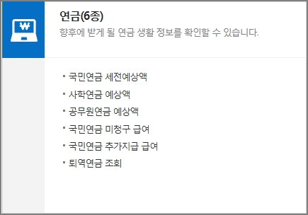 국민연금 세전예상액, 사학연금 예상액, 공무원연금 예상액, 국민연금 미청구 급여, 국민연금 추가지급 급여, 퇴역연금 조회 등 향후에 받게되는 연금 정보를 한번에 확인 가능합니다.