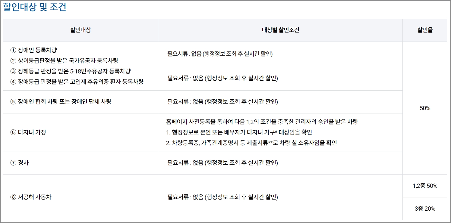 장애인 등록차량, 국가유공자 등록차량, 다자녀 가정 등은 50%할인이 됩니다. 저공해 차량을 이용하는 경우에도 20%(3종), 50%(1,2종) 받을 수 있습니다.