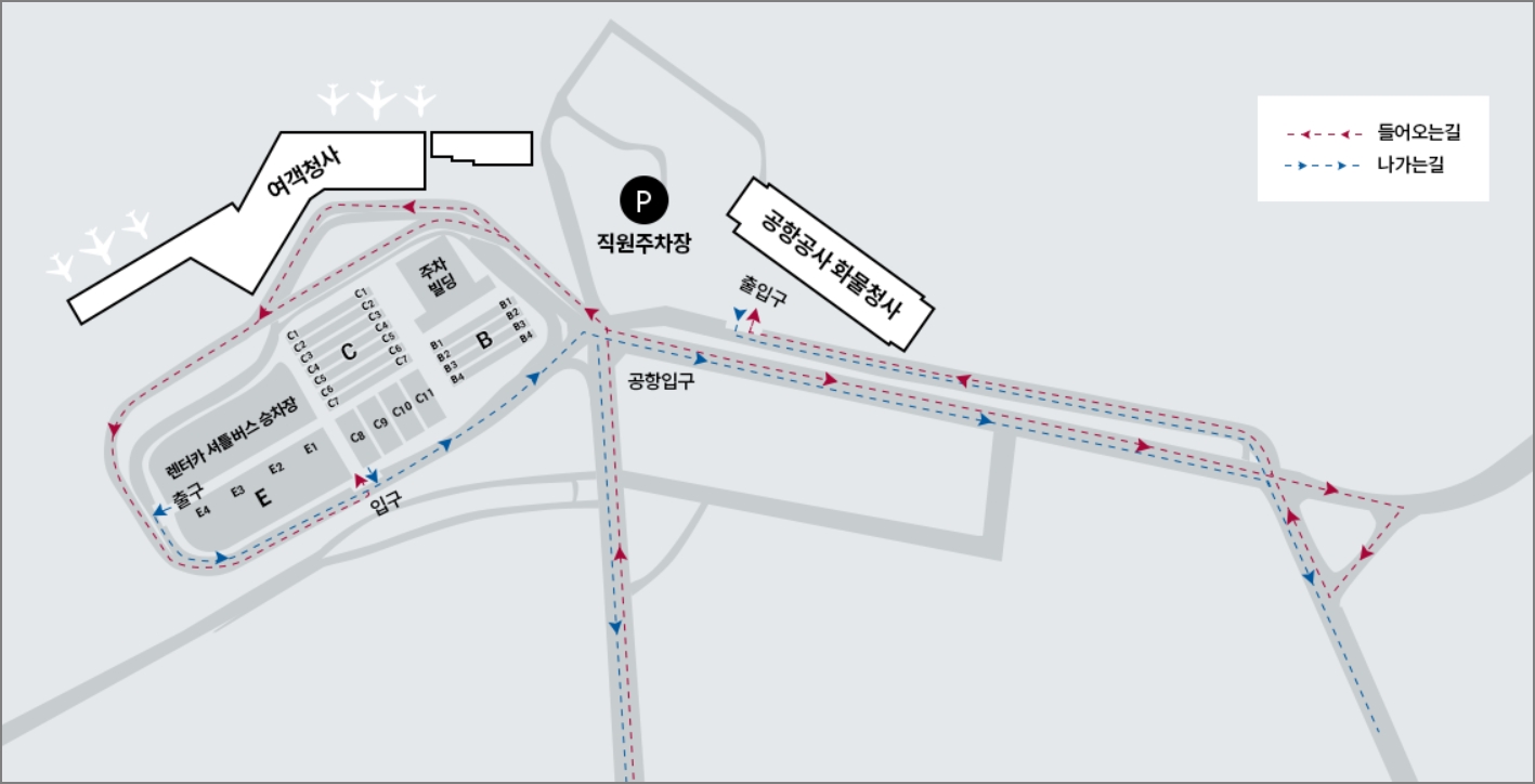 붉은색 길이 공항으로 들어오는 길입니다. 파란색 길은 공항에서 나가는 길입니다. 실제 제주공항 도로 노면에는 붉은색(들어오늘길)과 녹색(나가는 길)으로 표시 되어 있습니다.