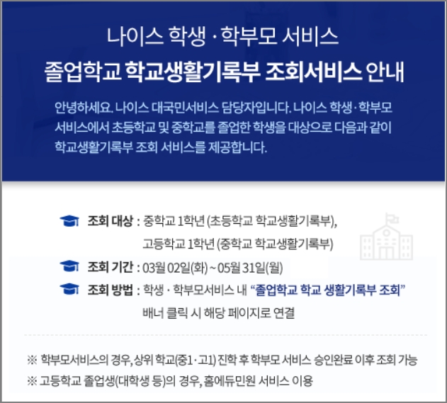 나이스 학생서비스와 학부모 서비스에서는 초등학교 및 중학교를 졸업한 학생을 대상으로 학생기록부 조회 서비스를 제공하고 있습니다. 나이스 학부모서비스에서는 초등학교 및 중학교 졸업 후 3개월 간 졸업학교 학교생활기록부 조회 서비스를 제공합니다.